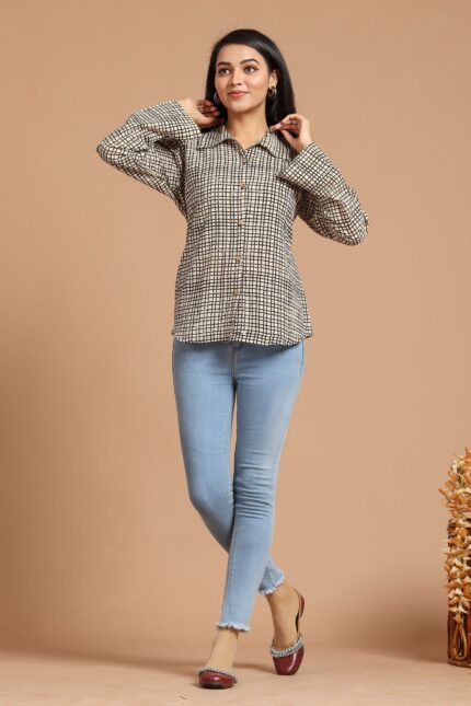 Beige & Black Checked Long Sleeve Cotton Shirt Top for Women ? Casual & Office Wear