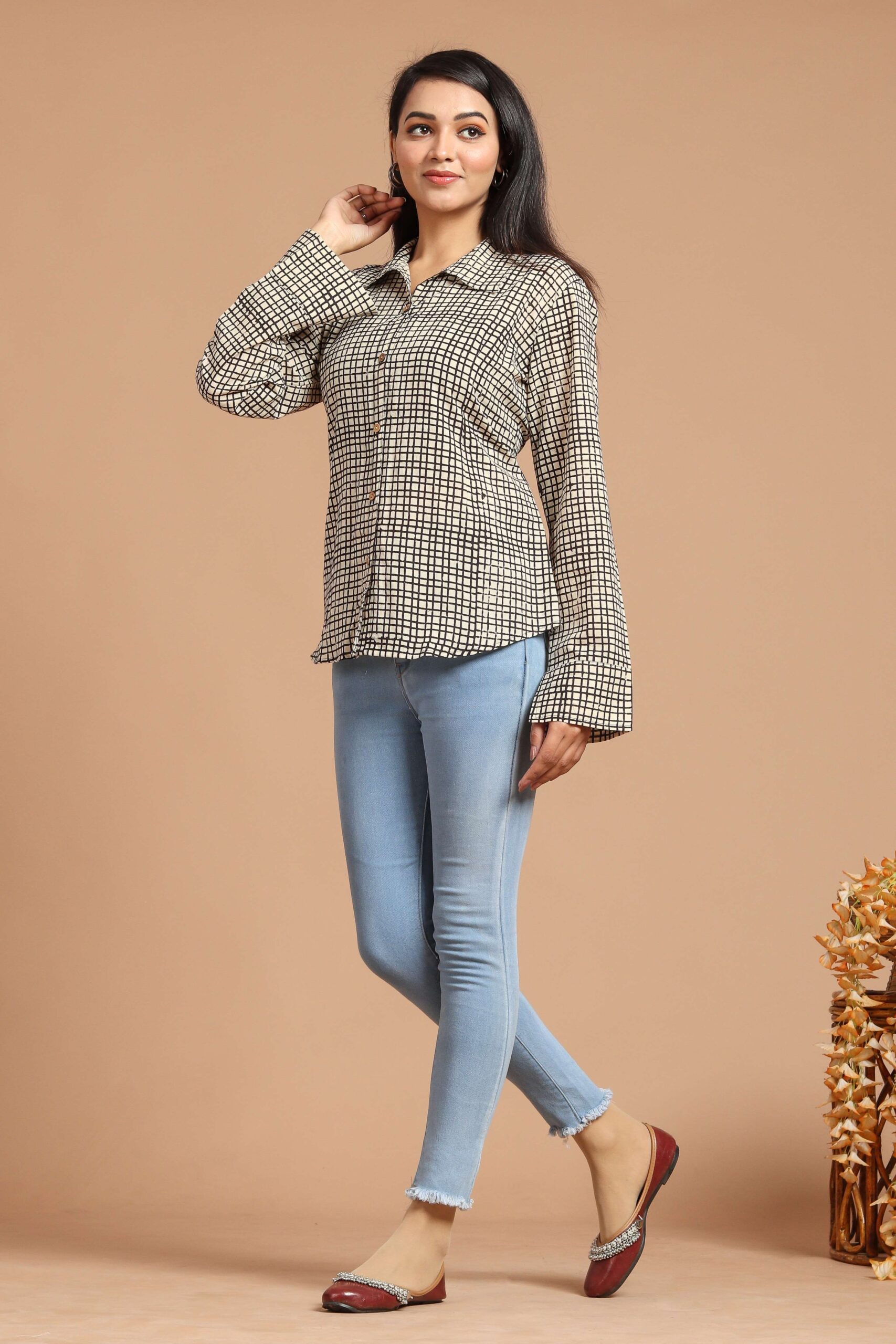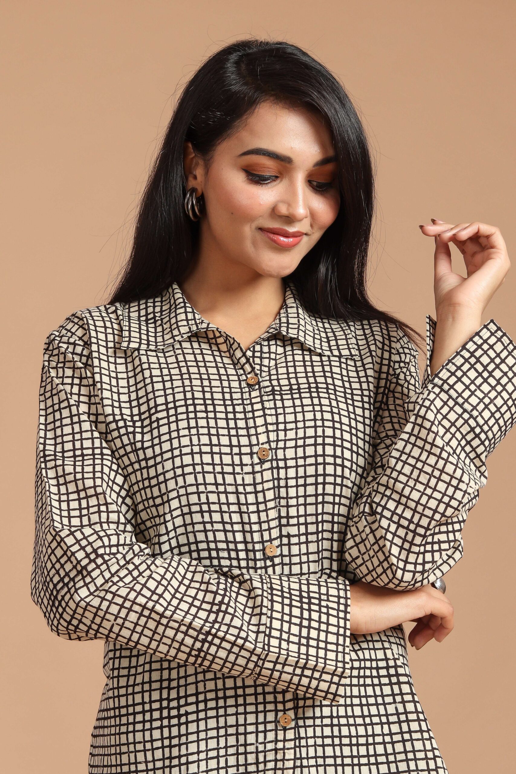 beige & black checked long sleeve cotton shirt top for women. Designed with a button-down front and relaxed fit, this versatile top is perfect for office wear, college fashion, or casual outings. Its soft fabric ensures all-day comfort, while the timeless checked pattern adds a chic modern touch. Pair it with jeans, trousers, or skirts for a polished look.