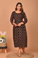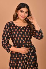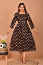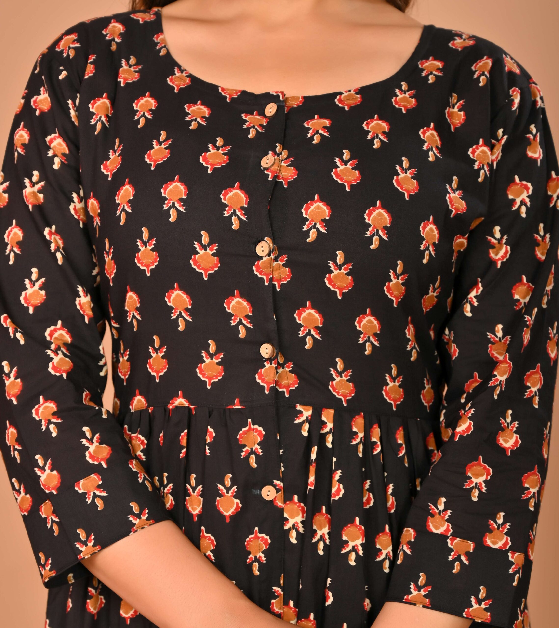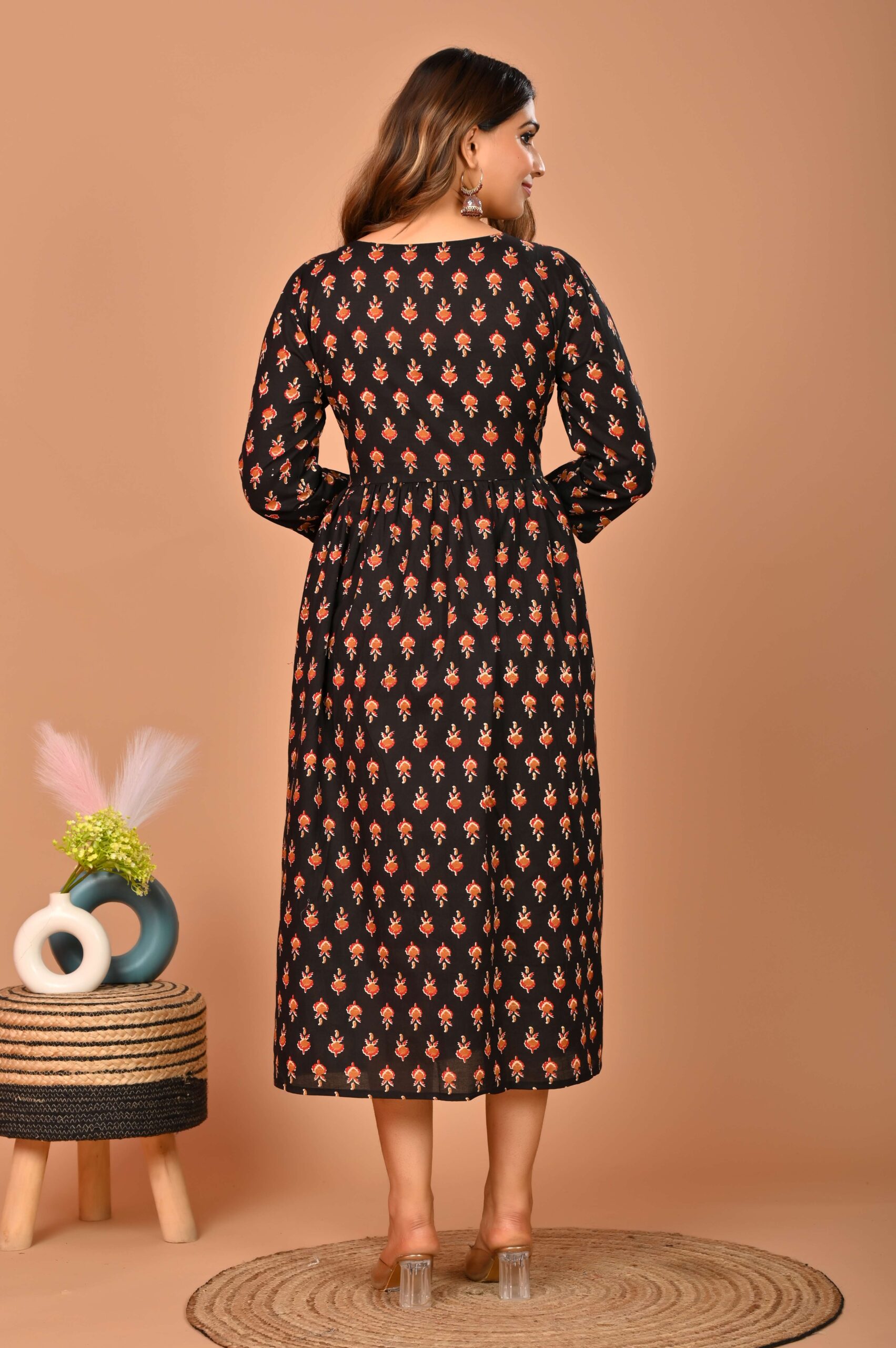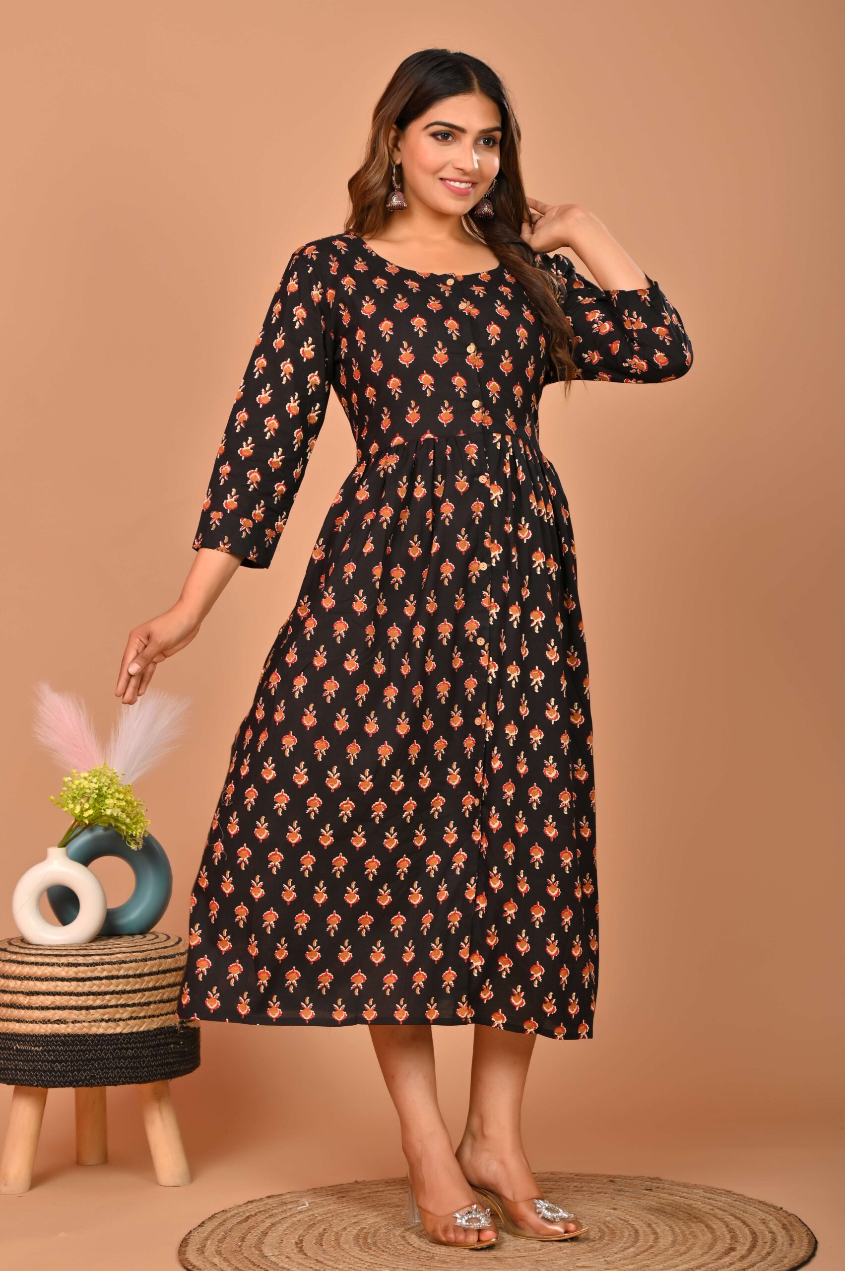 Effortless elegance with our Floral Printed A-Line Midi Dress, designed to keep you stylish and comfortable all day long. Crafted from premium breathable fabric, this dress features a timeless A-line silhouette that flatters every body type. The vibrant floral print on a classic black base adds a touch of charm, making it perfect for both daytime outings and evening gatherings.
