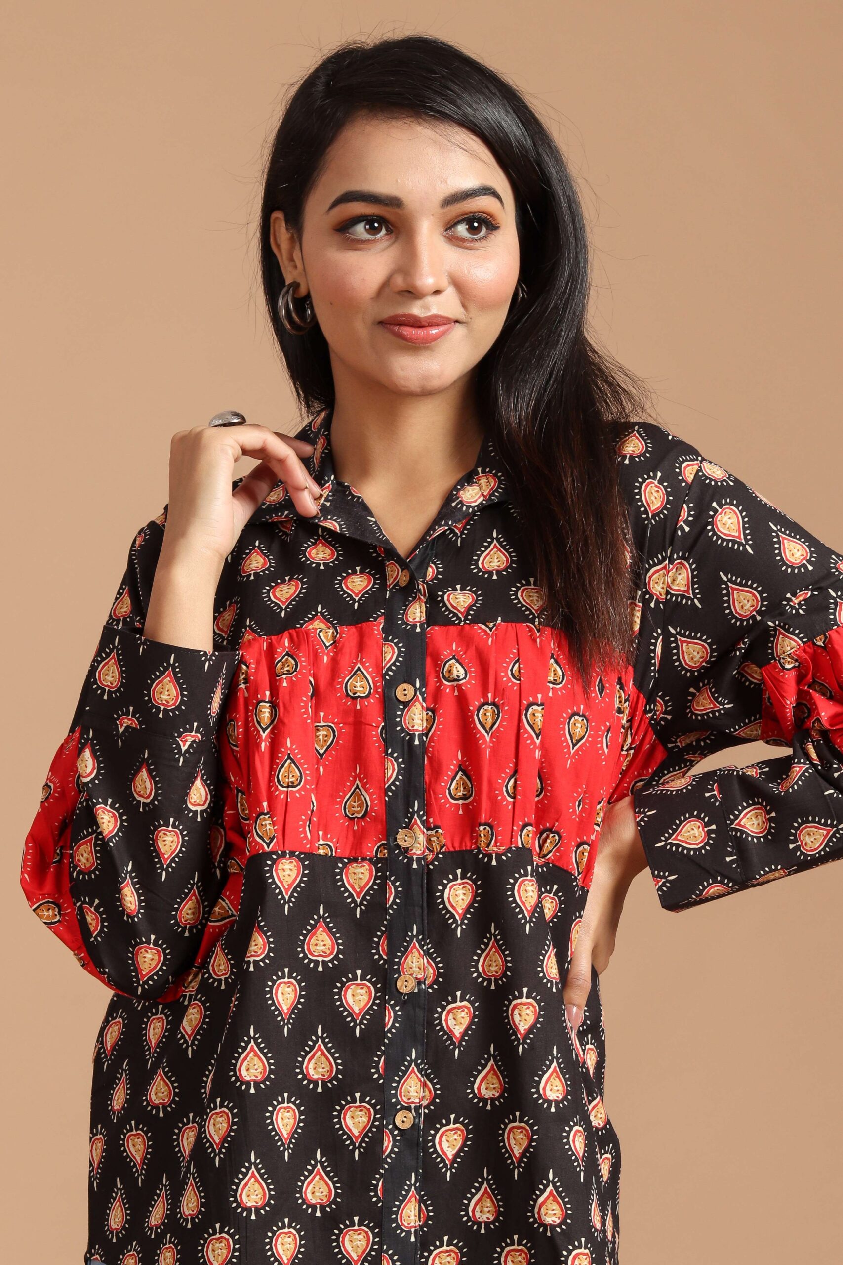 black & red printed long sleeve cotton top for women. Designed in a trendy shirt style with button detailing, this top features a unique ethnic print and a comfortable fit. Perfect for casual wear, office styling, or festive gatherings, it pairs beautifully with jeans, trousers, or skirts for a chic Indo-western look.