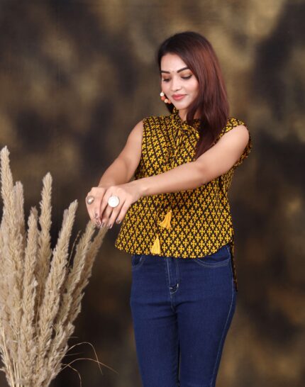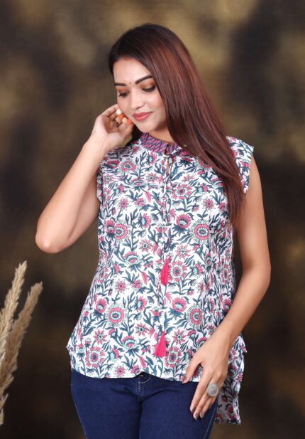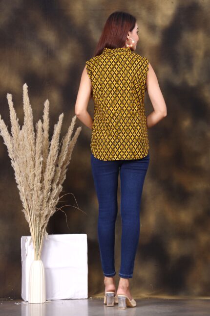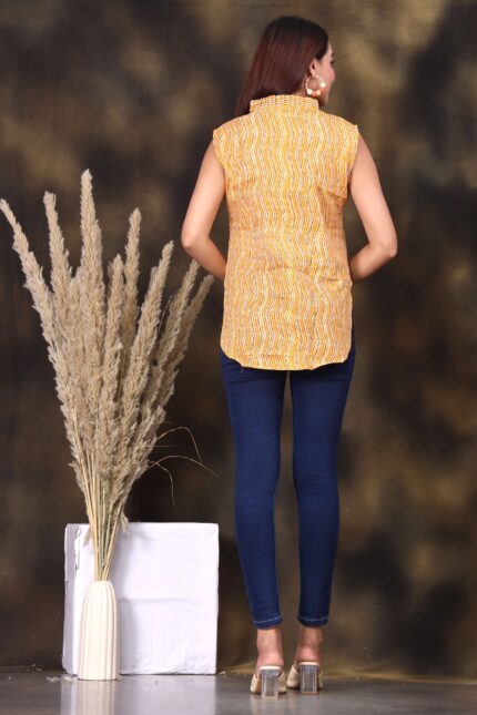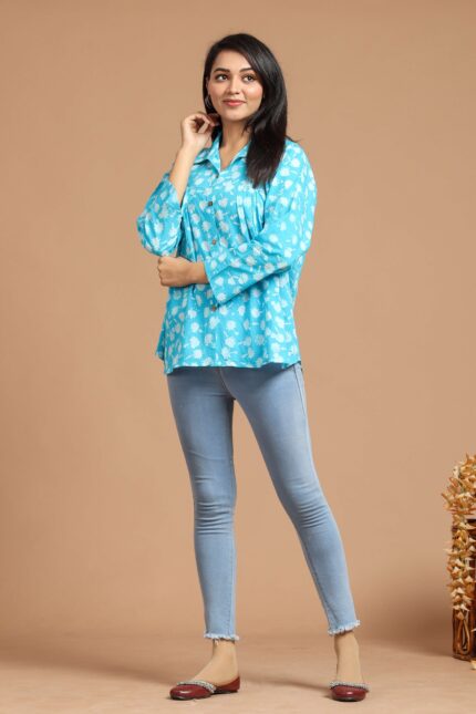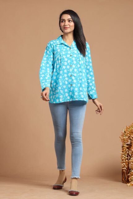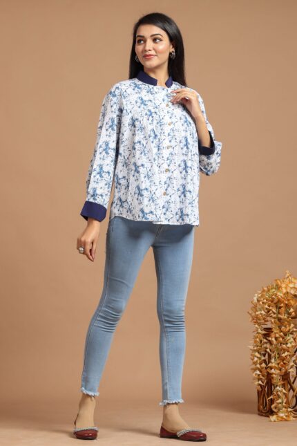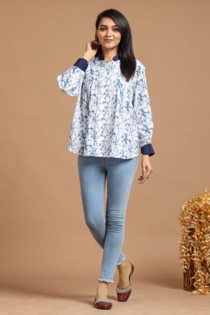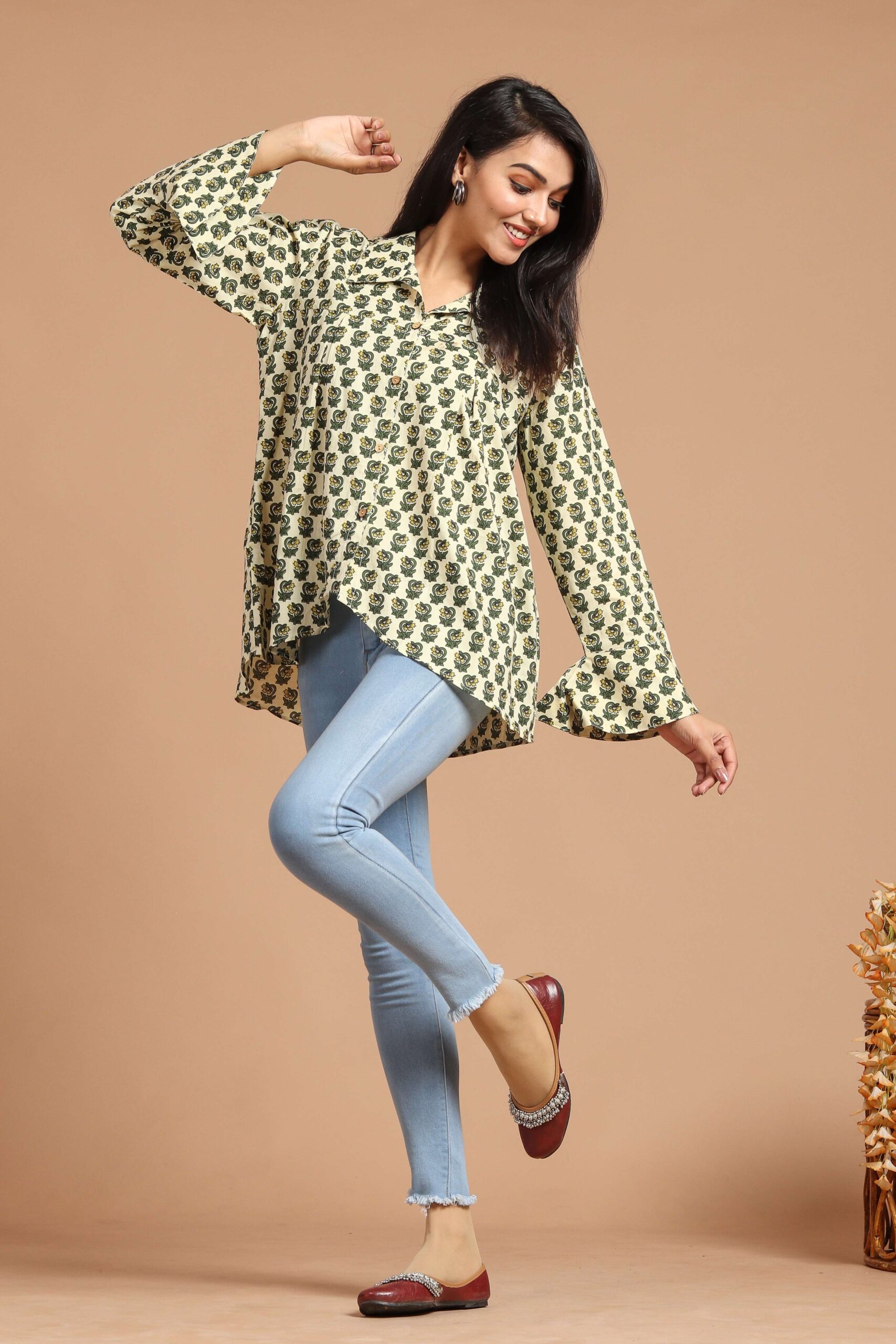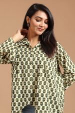 cream printed oversized long sleeve cotton top for women. Featuring a relaxed fit, shirt collar, and unique ethnic-inspired print, this top combines comfort with modern chic. Its lightweight, breathable fabric makes it perfect for casual outings, office wear, and travel looks. Style it with jeans, jeggings, or trousers for a fashionable Indo-western vibe.