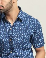 Men?s Navy Blue Printed Cotton Shirt with Small Dot Pattern ? Casual Summer Wear