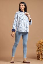 White printed sleeveless top for women, crafted from soft breathable fabric. Featuring a trendy tie-up neckline with tassels, this modern top is perfect for casual wear, office styling, or weekend outings. Its monochrome pattern adds a chic touch, making it easy to pair with jeans, trousers, or skirts for a versatile look.