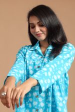 Blue floral printed cotton shirt-style top for women. Designed with a collared neckline, button-down front, and full sleeves, it offers a relaxed yet stylish look. The breathable cotton fabric makes it comfortable for daily wear, office meetings, or casual outings. Pair it with jeans, trousers, or skirts for a chic Indo-western vibe.