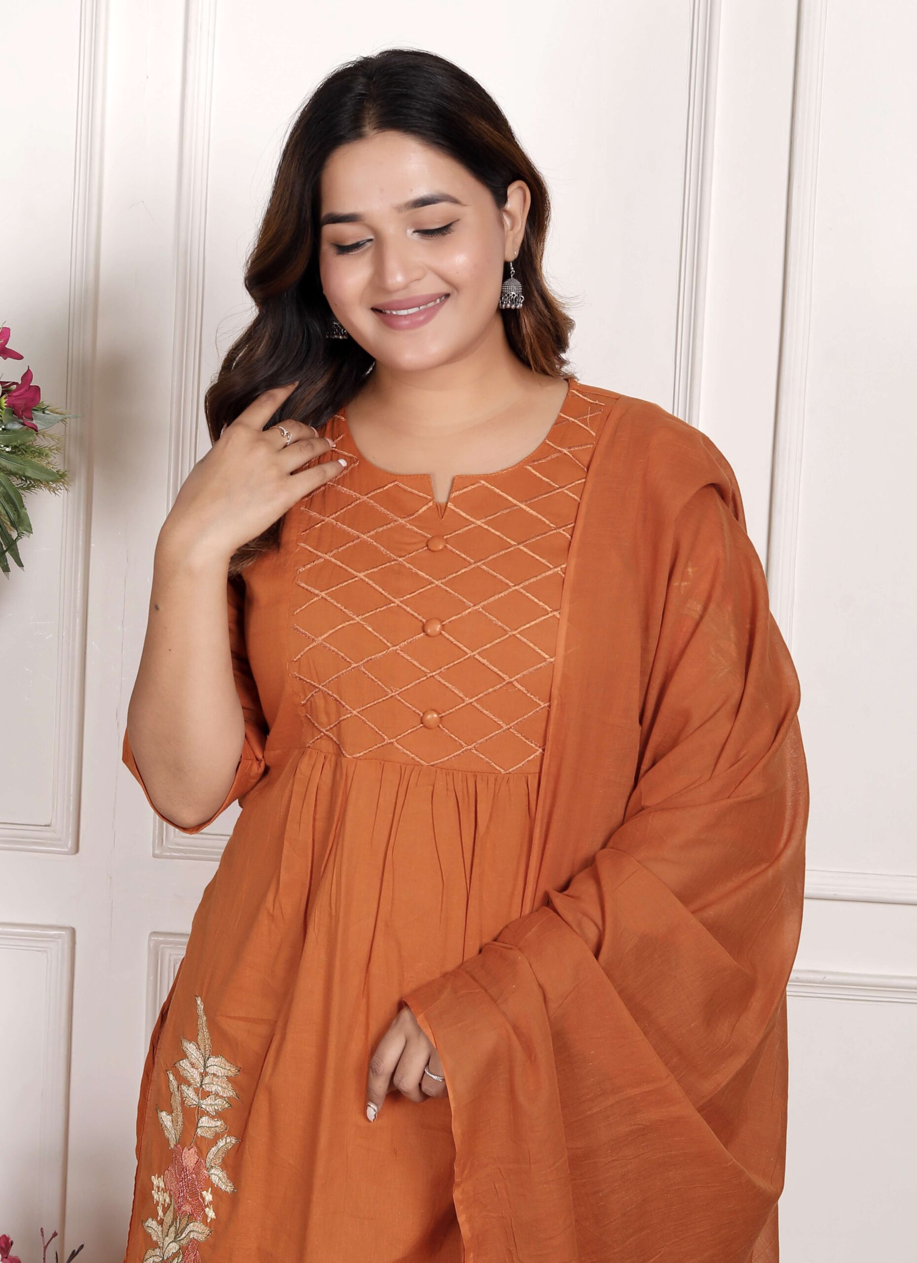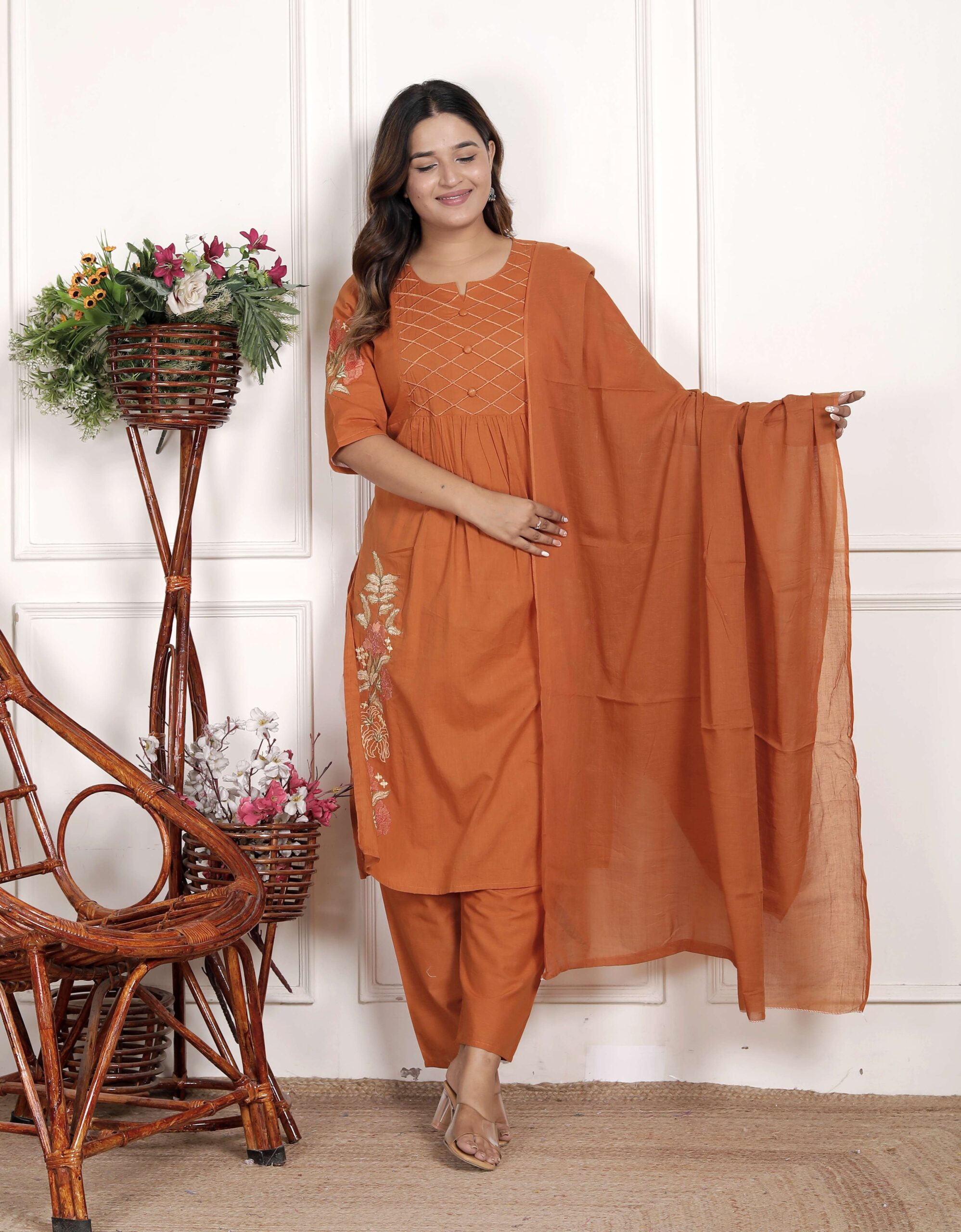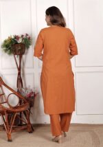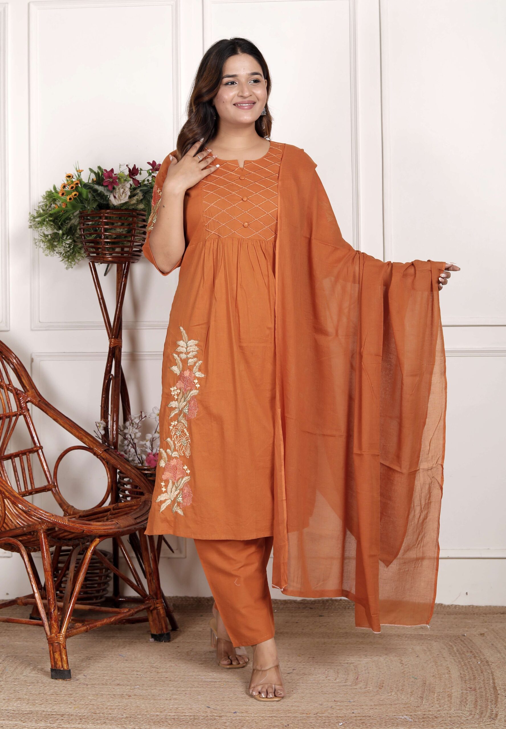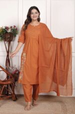 Women’s Cotton Embroidered Straight Kurti With Pant and Dupatta Set (Orange)