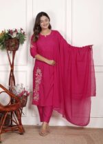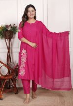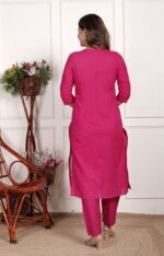 Women’s Cotton Embroidered Straight Kurti With Pant and Dupatta Set (Pink)