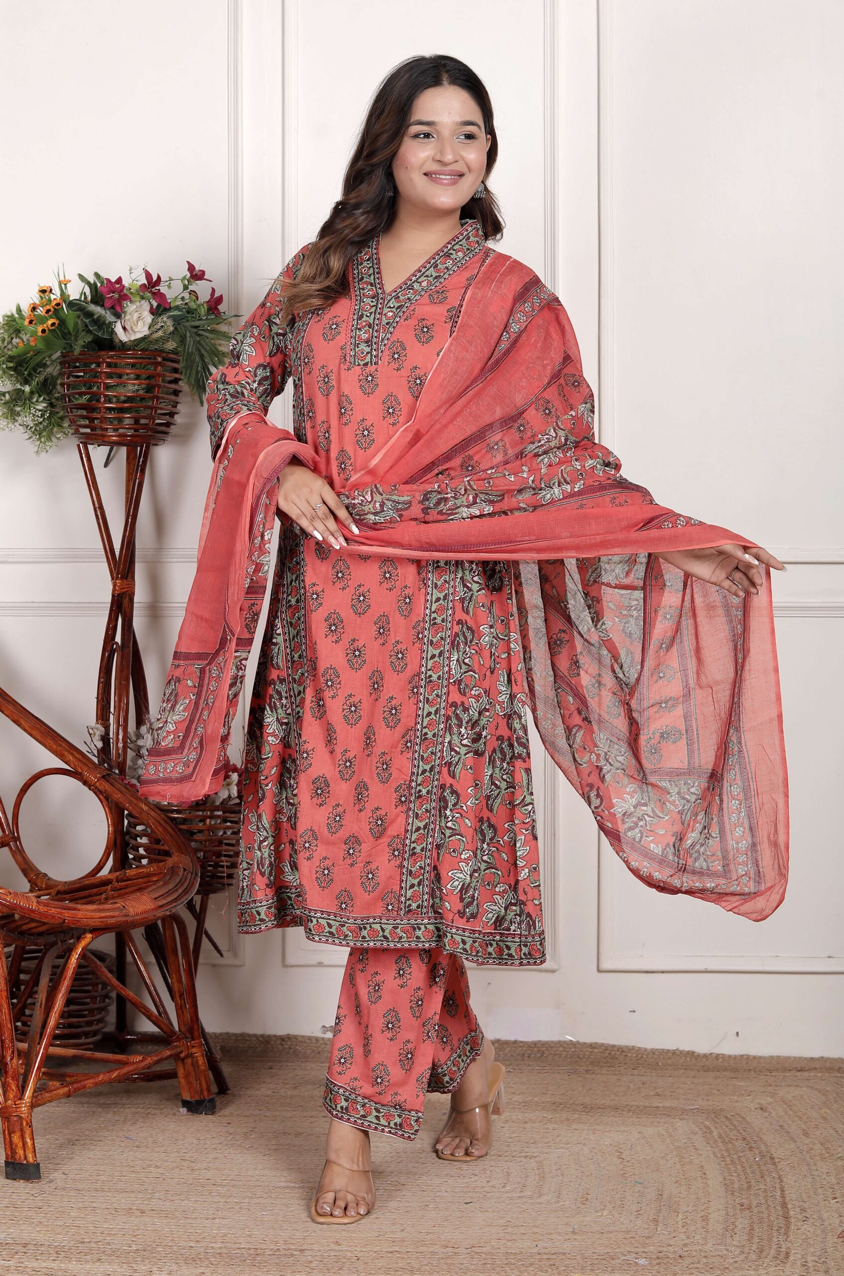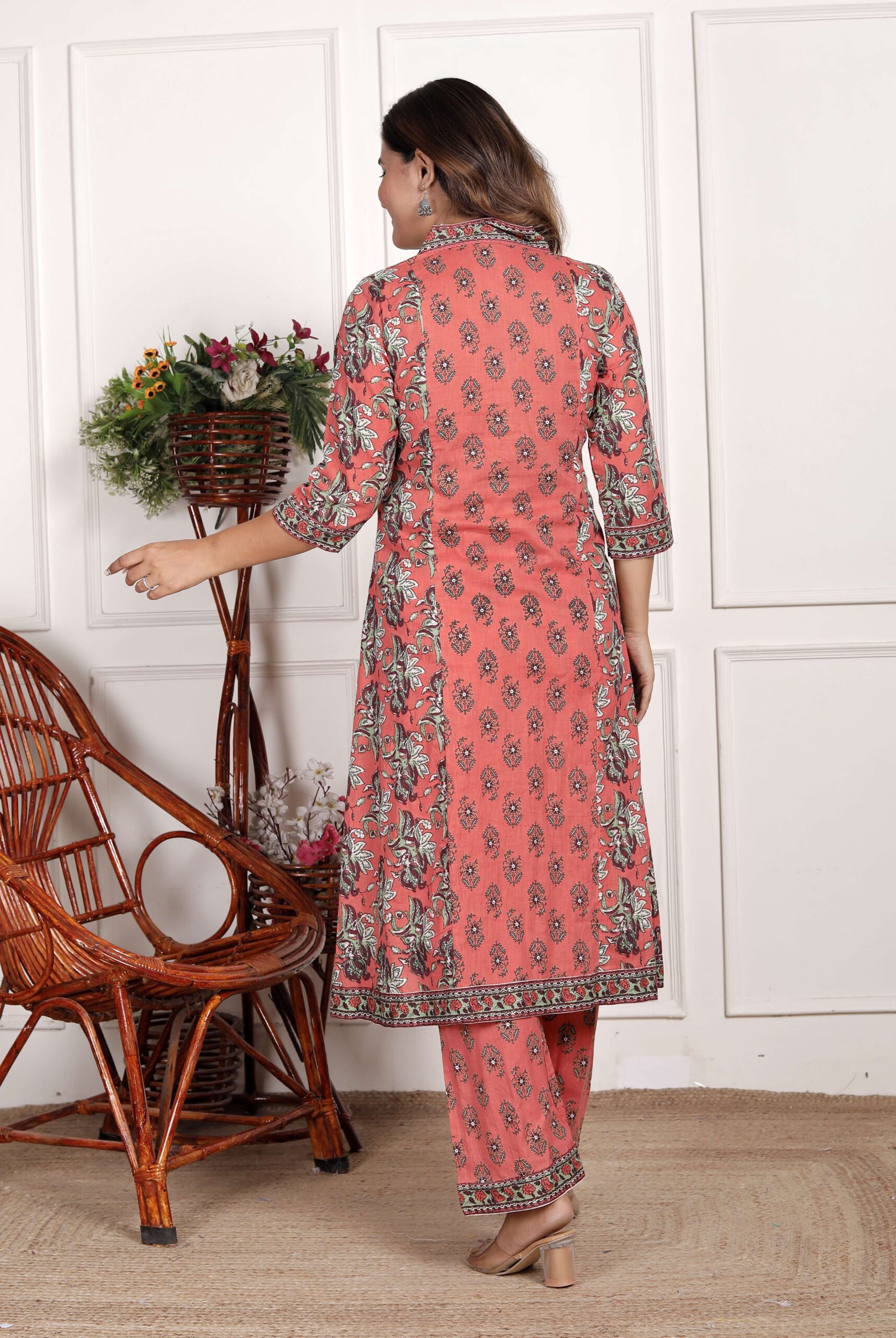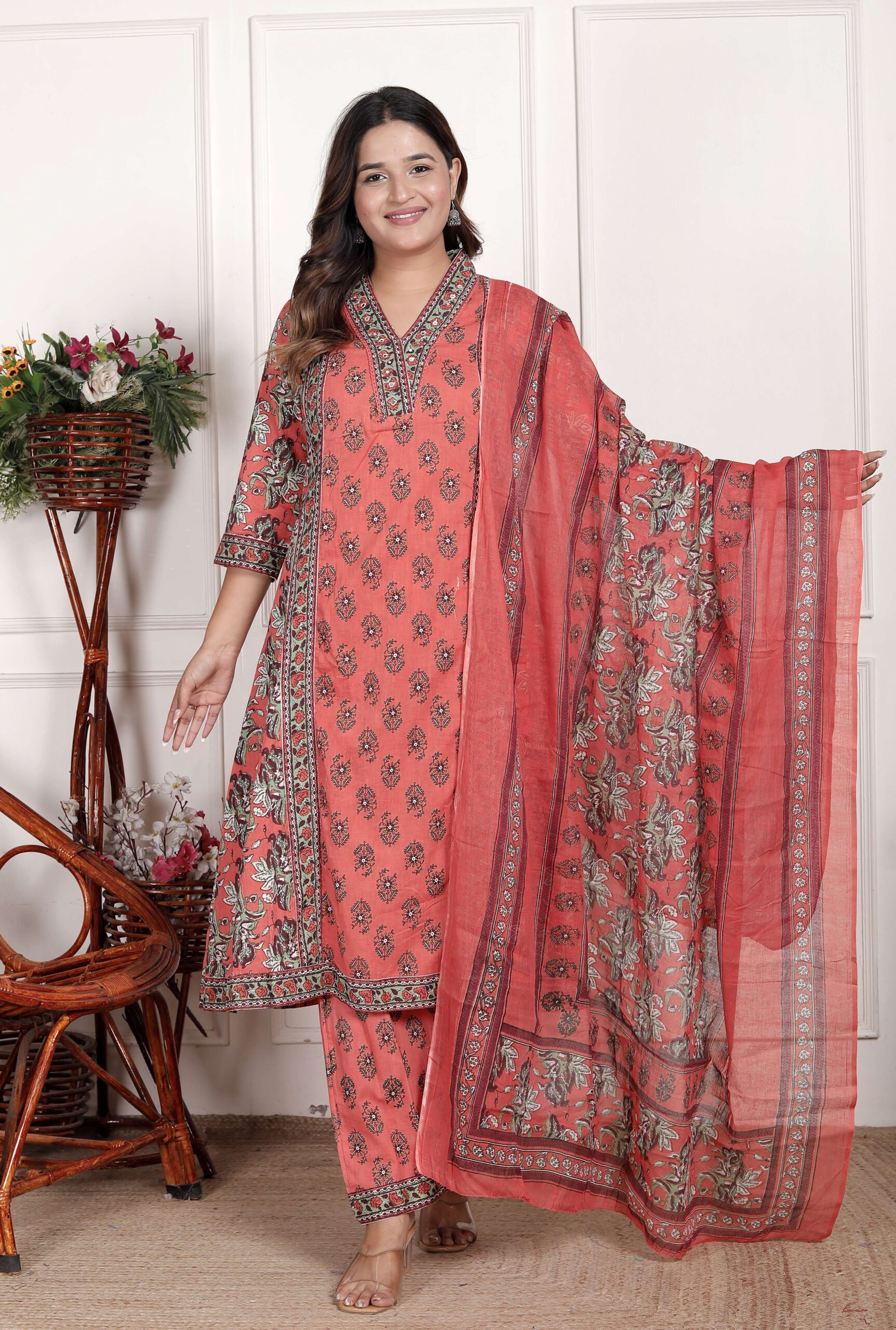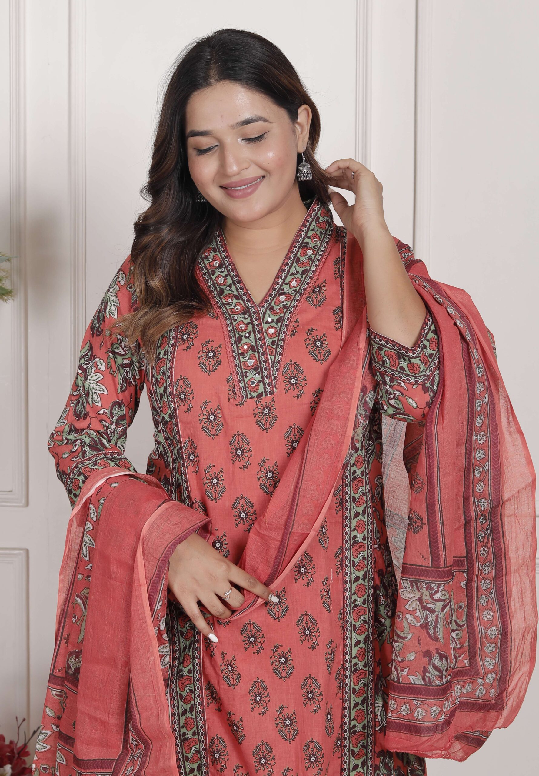 Women’s Cotton Printed Straight Kurti With Pant and Dupatta Set (PEACH)