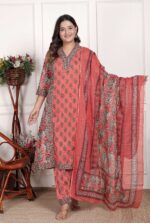 Women’s Cotton Printed Straight Kurti With Pant and Dupatta Set (PINK)
