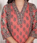 Women’s Cotton Embroidered Anarkali Kurti With Pant (PINK)