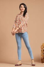 peach floral printed cotton shirt-style top for women. Designed with a collared neckline, button-down front, and full sleeves, it offers a relaxed yet stylish look. The breathable cotton fabric makes it comfortable for daily wear, office meetings, or casual outings. Pair it with jeans, trousers, or skirts for a chic Indo-western vibe.